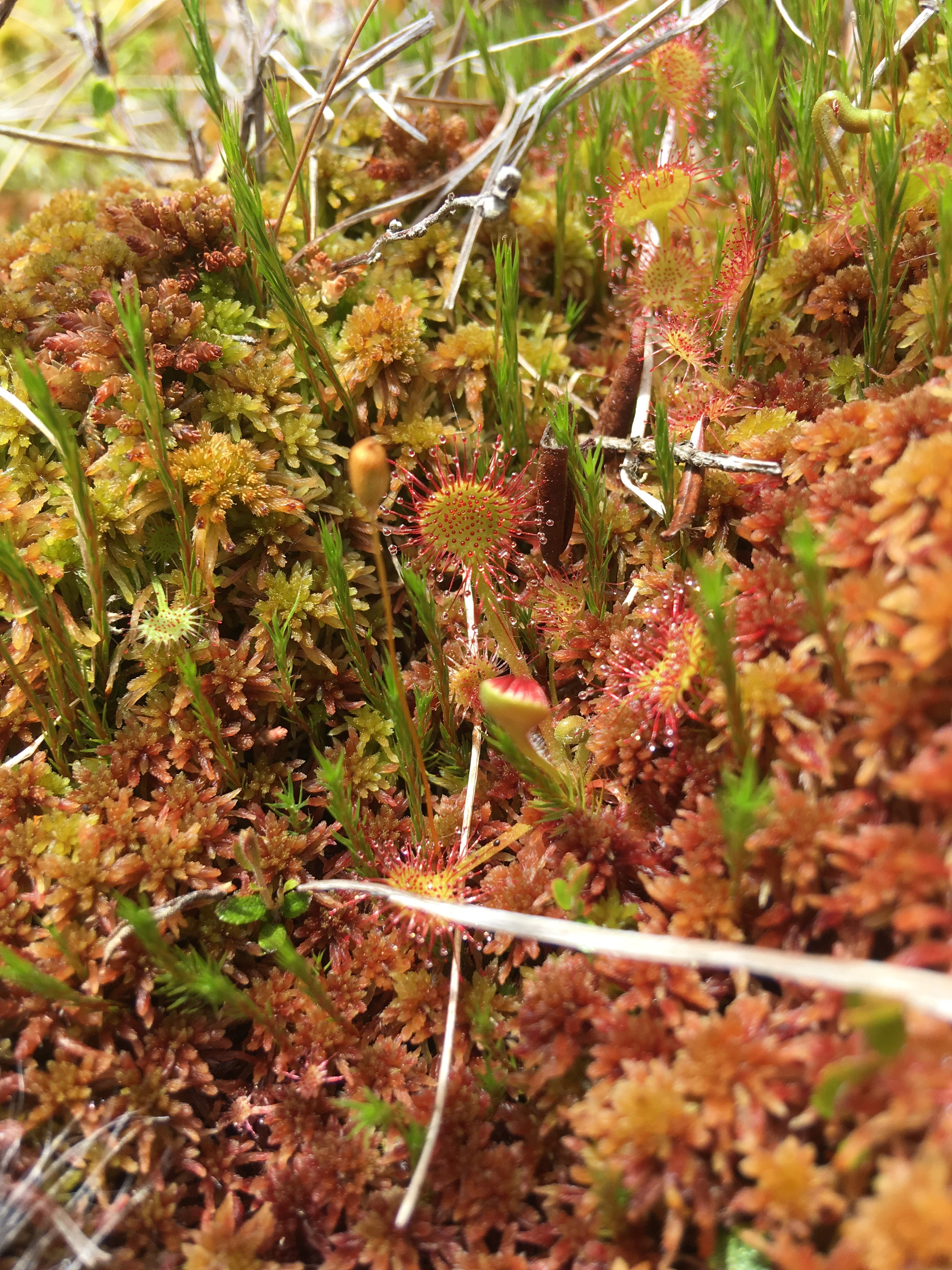 Plant of the Week! You can see fall colors in the summertime if you get up close to a muskeg, which is a nutrient poor, water saturated peatland. Due to the high acidity and low nutrients, such environments are not very diverse, but many of the plants that live there are unique to such a place. One of these unusual plants is Drosera rotundifolia, Round-leaved Sundew. This is one of four of Wisconsin’s native sundews, and to fully appreciate it, you have to get close to the ground. Each leaf has many beautiful red trichomes that secrete a sticky substance that traps insects. The amount of carnivory the plants engage in is dictated by the nutrient conditions of their environment. According to Adirondack Wildflowers (http://wildadirondacks.org/adirondack-wildflowers-roundleaf-sundew-drosera-rotundifolia.html), “studies have shown that the proportion of nitrogen derived from carnivory varies from about a quarter to about half.”