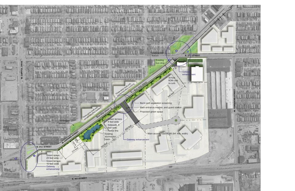 Century City is an urban industrial revitalization project in Milwaukee, Wisconsin. Many public and private stakeholder organizations have been involved in re-imagining this former site of major manufacturers such as Tower Automotive as a place for businesses of the future to flourish. Marek Landscaping has been hired as a consultant to provide stormwater, green infrastructure, and circulation design, focusing on a pedestrian greenway along Hopkins Street. We also provided sizing and quantities of concrete and brick that can be reclaimed during site demolition and used in future stormwater infrastructure construction.