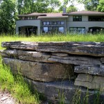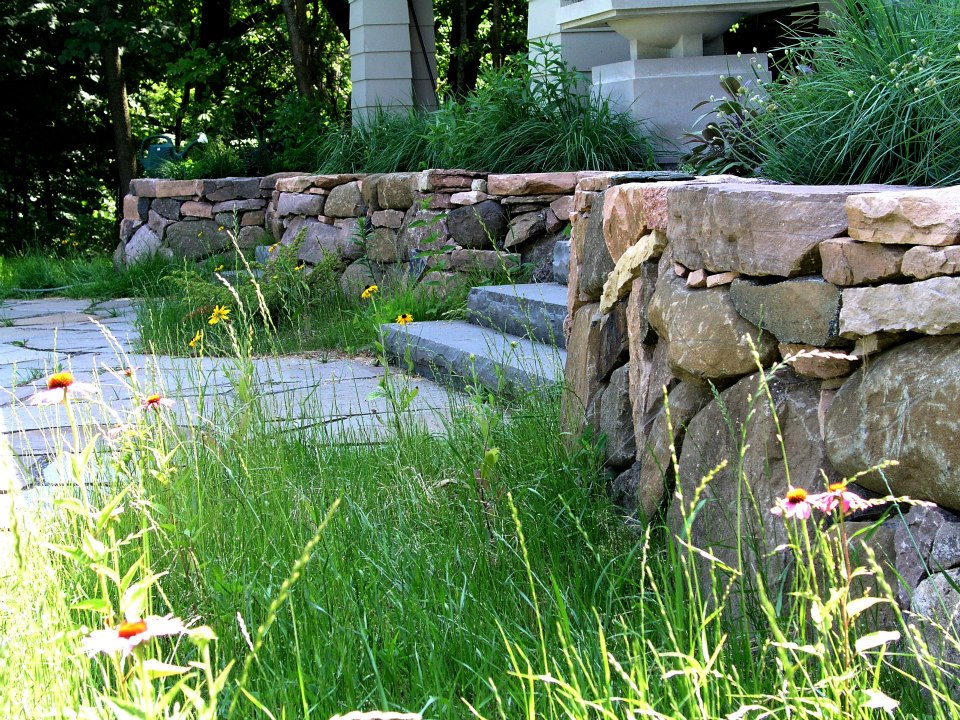 The softscape features include three native plant communities; woodland, meadow, and prairie. The plantings were also placed within stepping stone walkways, natural stone planters, and woodland paths.
