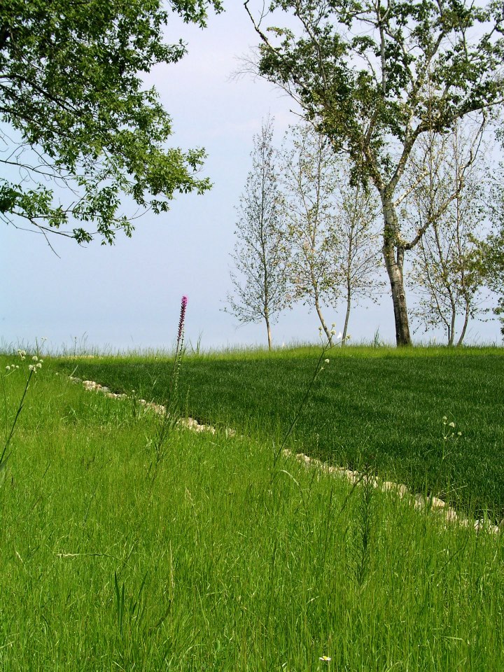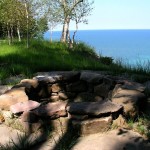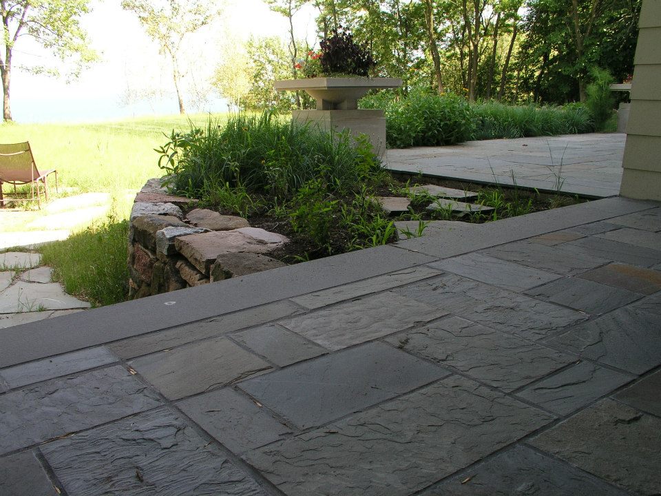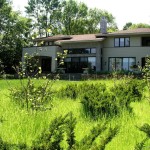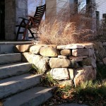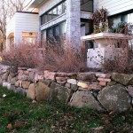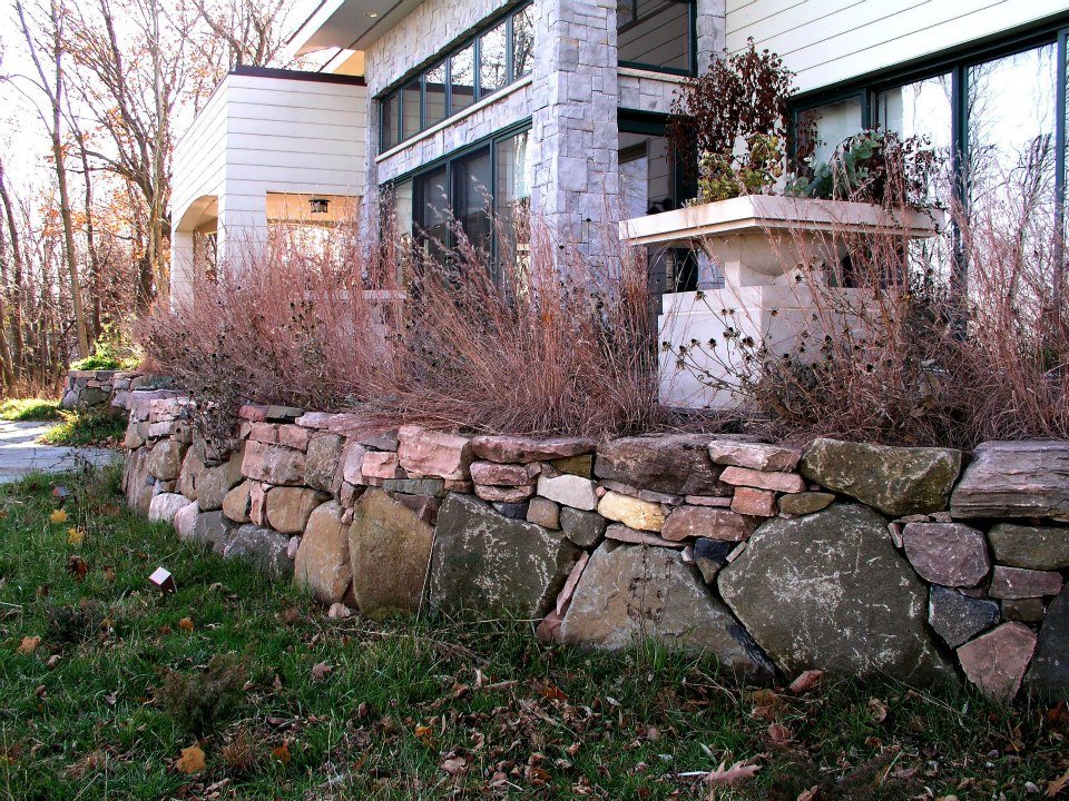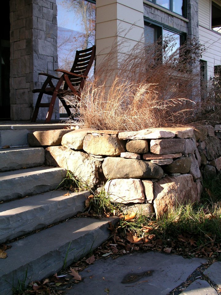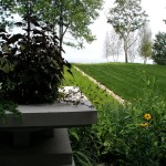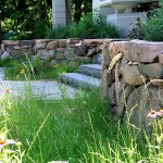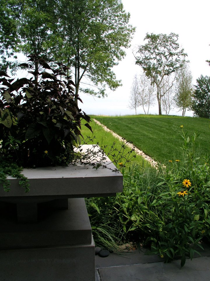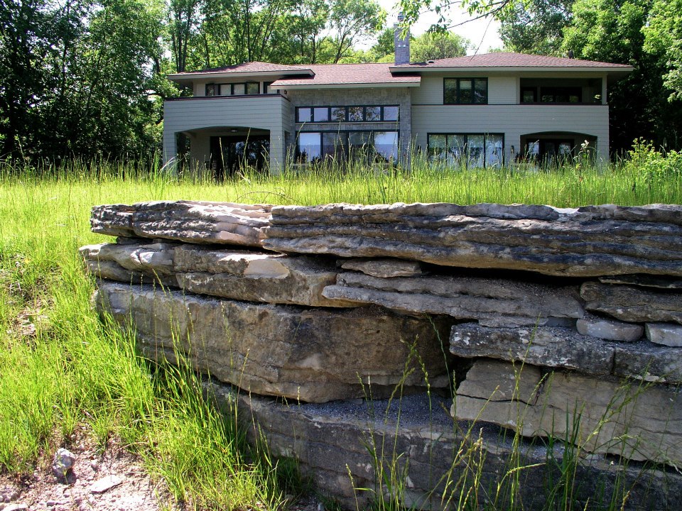 Hardscape features include dry stacked walls using collected fieldstone, limestone planters, and a fire pit. The fieldstone was collected from a Waukesha County farm and retains moss and lichens, adding to its “always there” appearance. A fieldstone “fence” provides reference to the lands’ agrarian roots, while suggesting an architectural extension of the house. Dry-laid New York Bluestone was used for walking paths and patios. Weather-edged Lannon stone was used to mimic bedrock outcroppings where the landscape meets the bluff. Recycled granite pavers, from a roadway project in Milwaukee, were used for the driveway to lend an “Old World” look to the fore-court of the house.