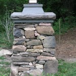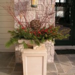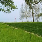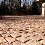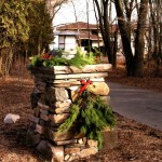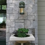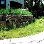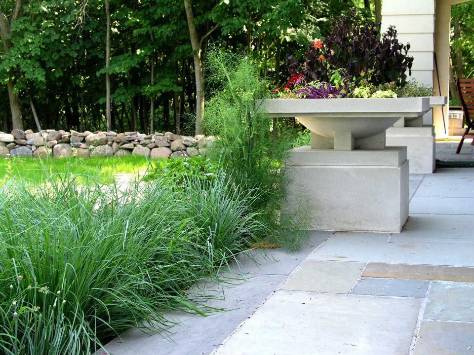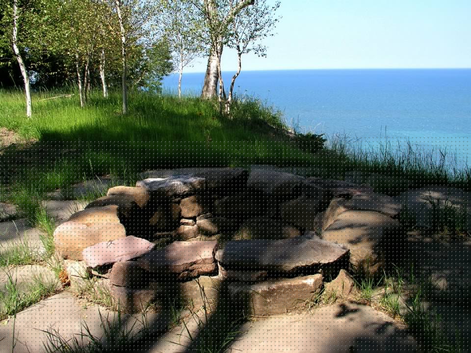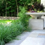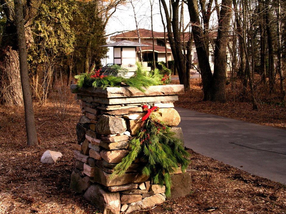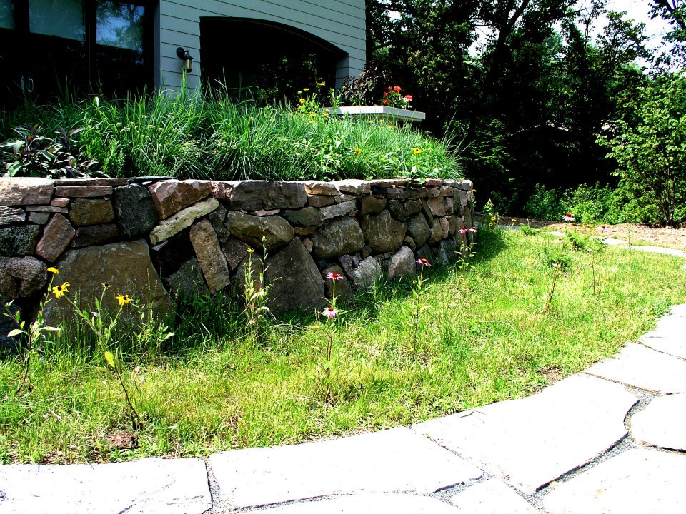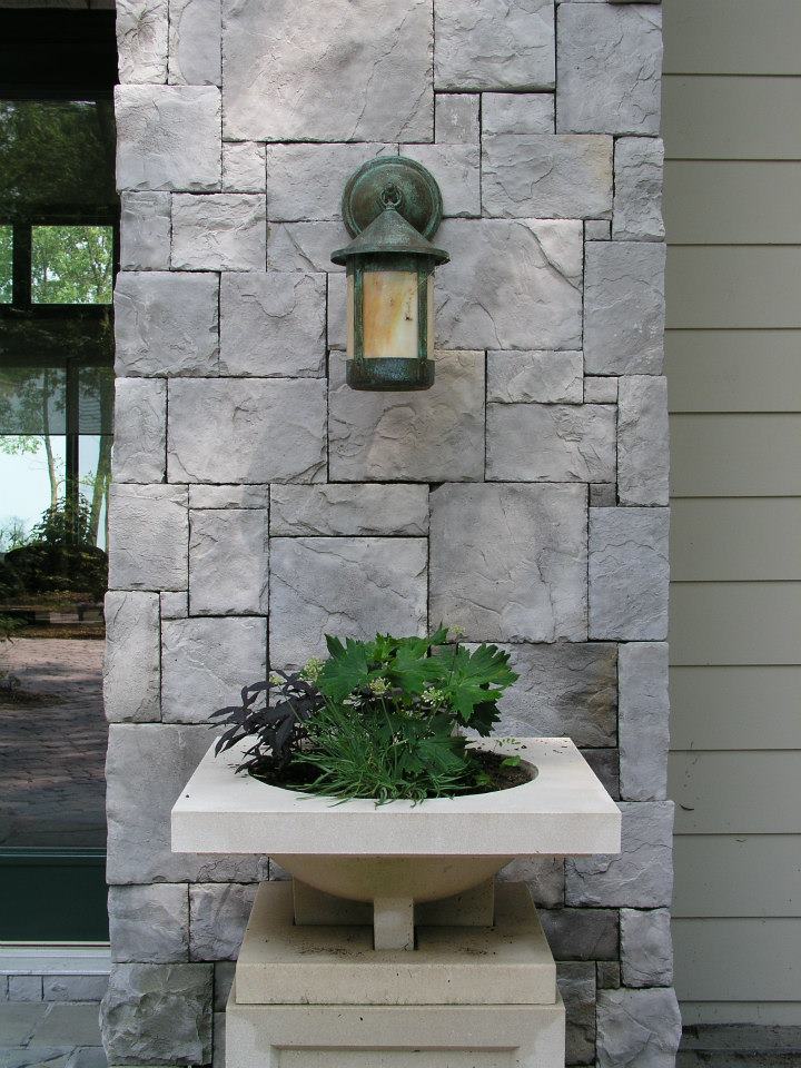 Hardscape features include dry stacked walls using collected fieldstone, limestone planters, and a fire pit. The fieldstone was collected from a Waukesha County farm and retains moss and lichens, adding to its “always there” appearance. A fieldstone “fence” provides reference to the lands’ agrarian roots, while suggesting an architectural extension of the house. Dry-laid New York Bluestone was used for walking paths and patios. Weather-edged Lannon stone was used to mimic bedrock outcroppings where the landscape meets the bluff. Recycled granite pavers, from a roadway project in Milwaukee, were used for the driveway to lend an “Old World” look to the fore-court of the house.