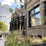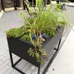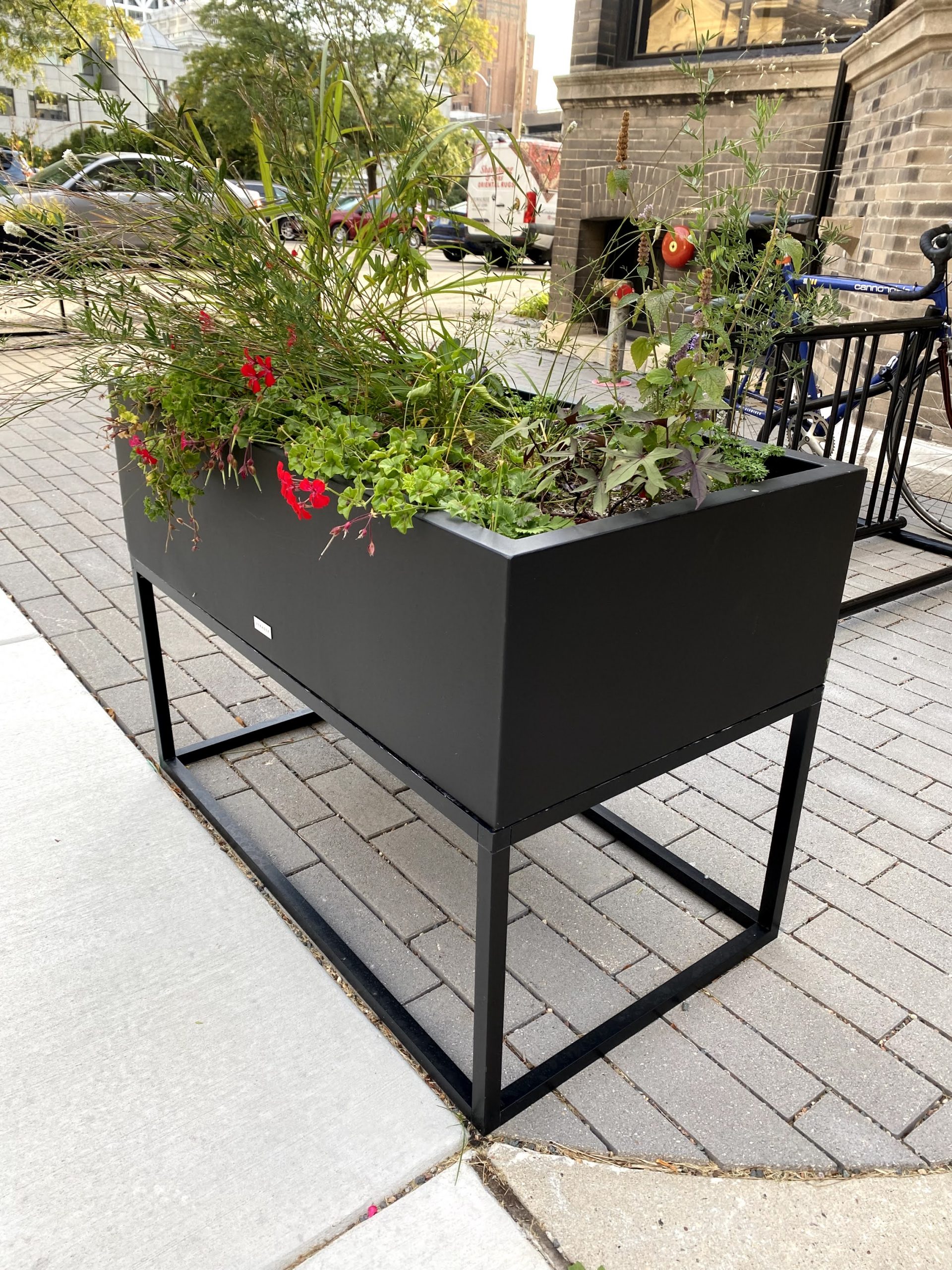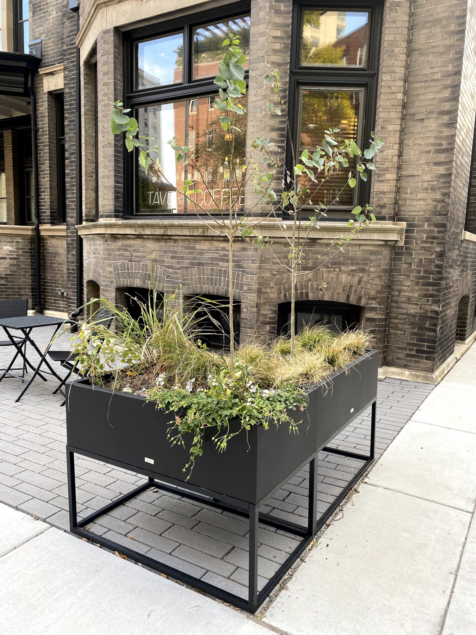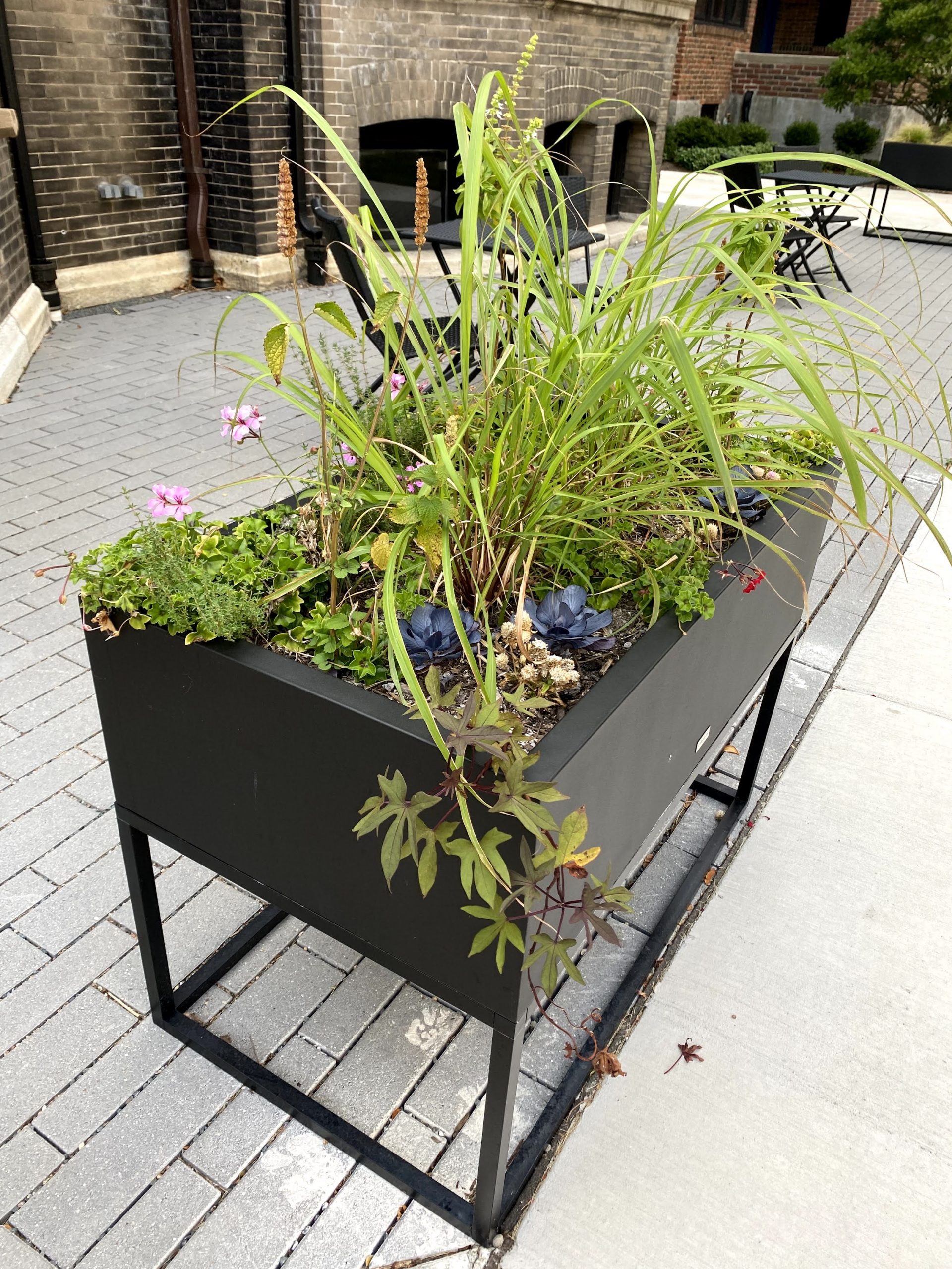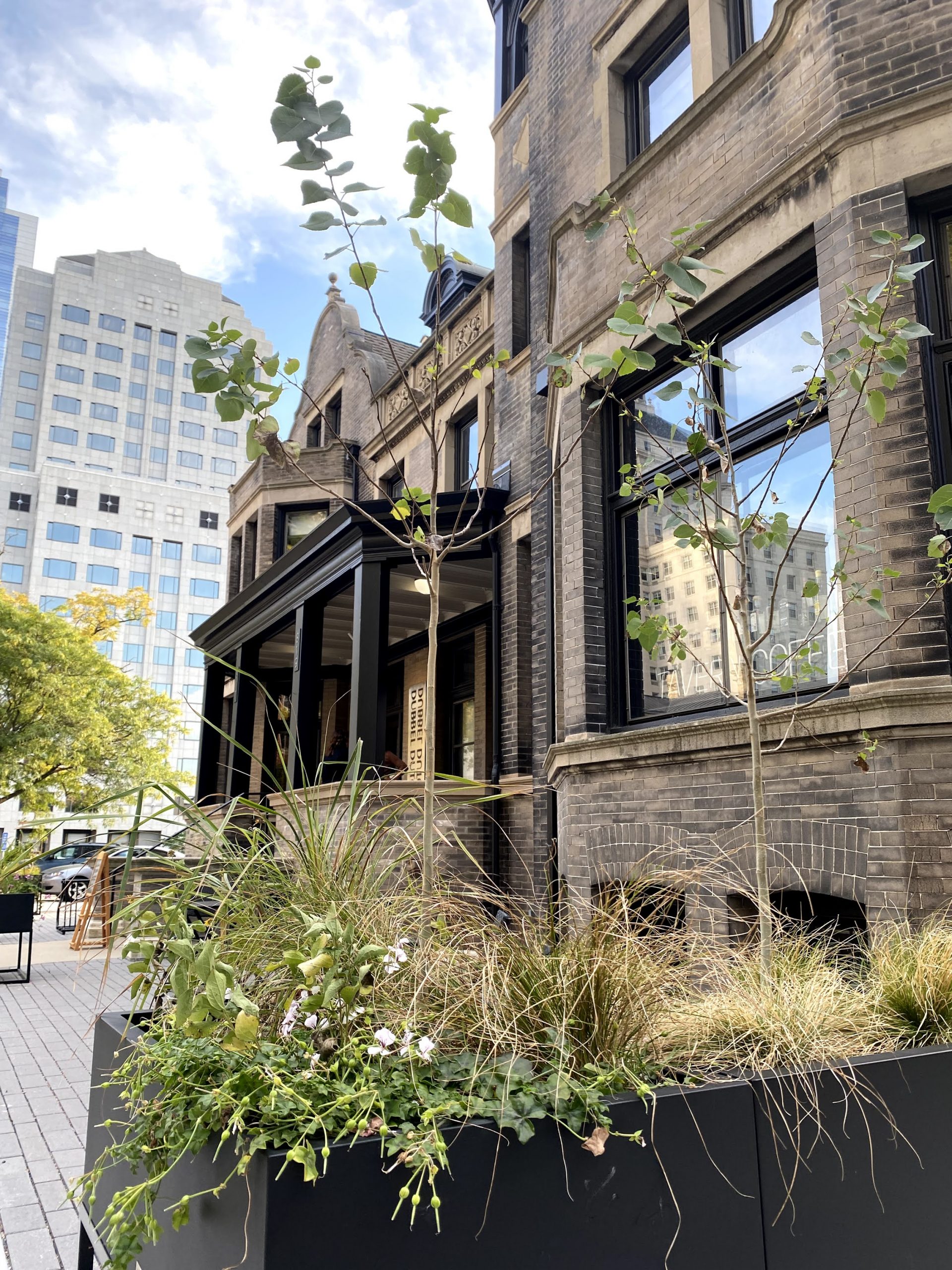 In 2021 our stewardship team installed six planters on the property to add some greenery to this urban landscape. Each planter is unique, containing a variety of sedges, grasses, shrubs, forbs, and even trees native to the area. Some of the species you’ll spot in these planters include quaking aspen (Populus tremuloides), eastern star sedge (Carex radiata), common witch-hazel (Hamamelis virginiana), and purple prairie clover (Dalea purpurea). These plants were chosen due to their being low-maintenance and able to survive in an urban environment, in addition to their ornamental value.