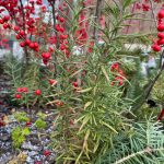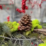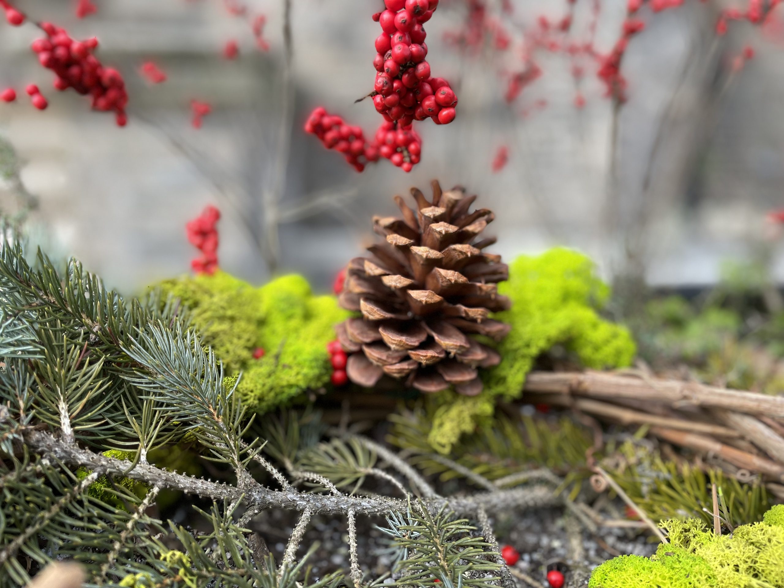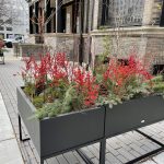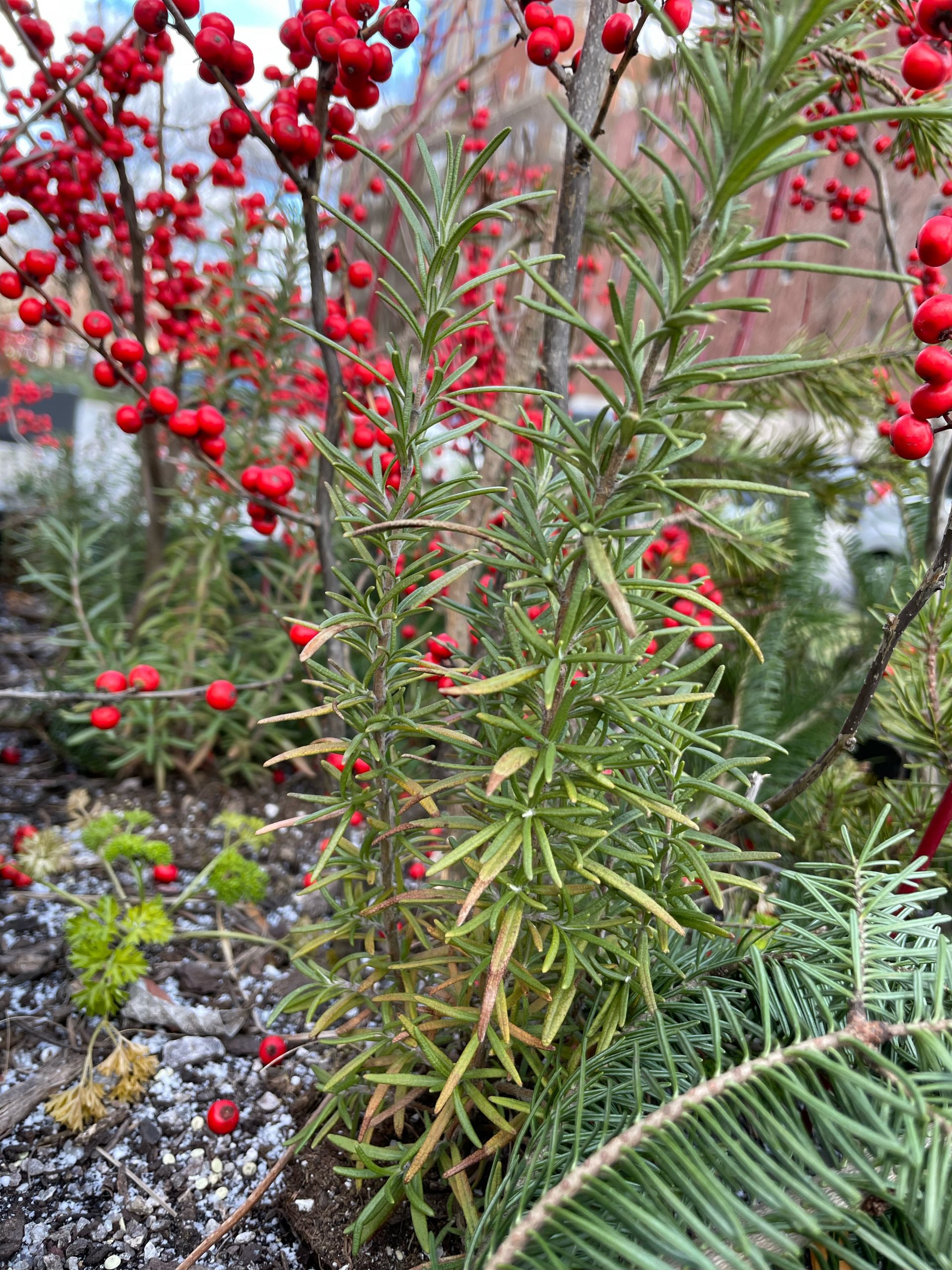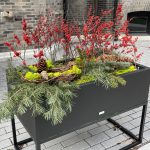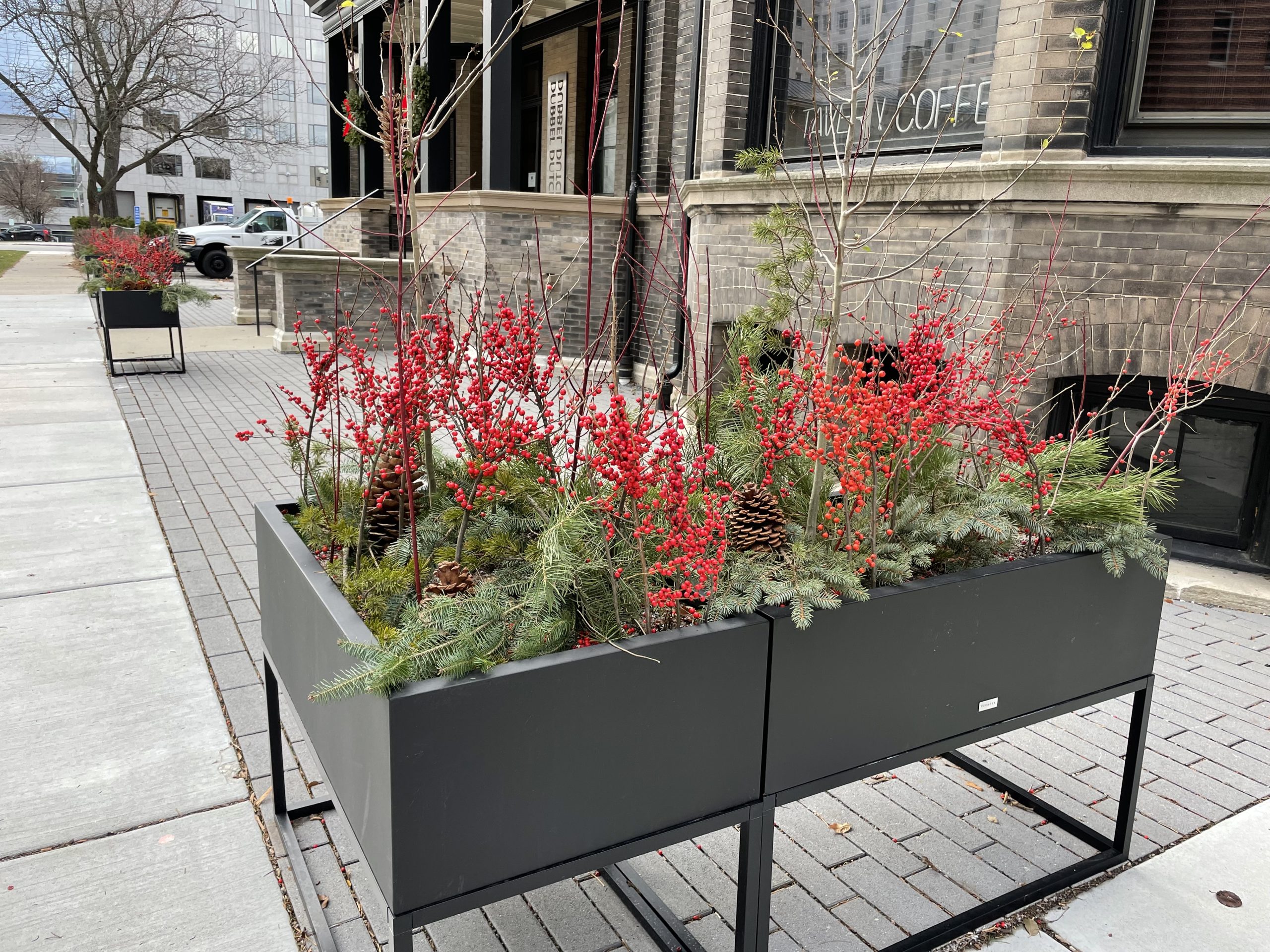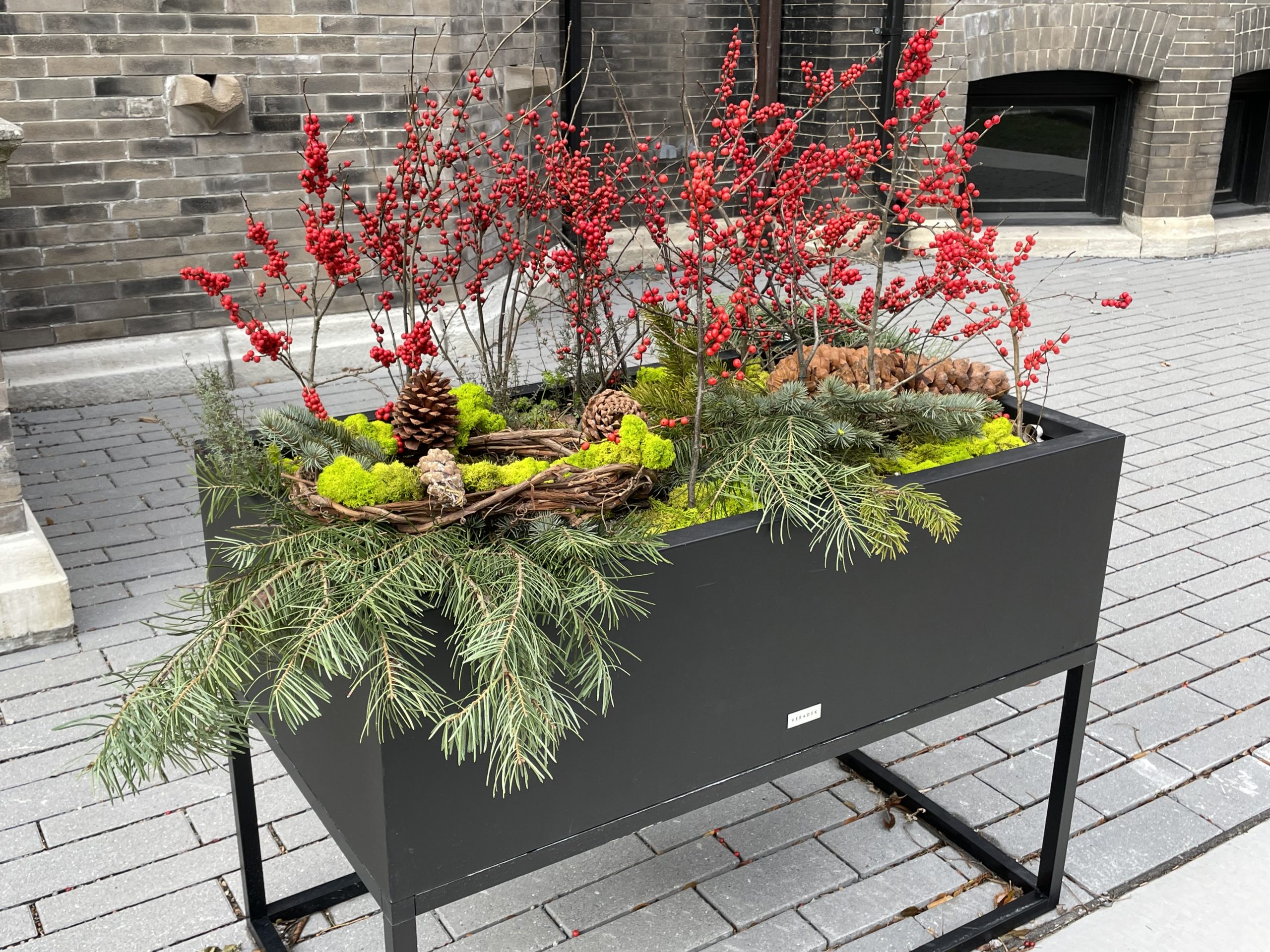In winter, we decorated the planters with festive boughs, winterberry, and reindeer moss.