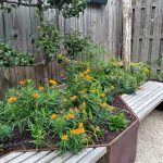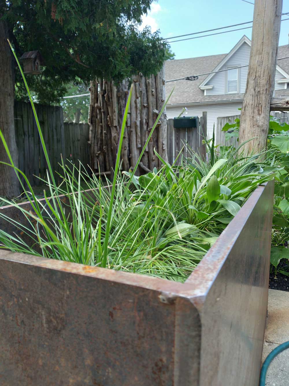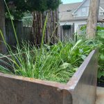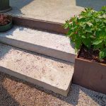 Natural stone stairs lead into the patio space lined with cor-ten steel, floating black locust benches, and two custom cor-ten steel planters. Ten-foot black locust posts were installed in the corners to allow for café-style string lights to be hung. Ten square feet of concrete, which made up much of the original patio, was removed to increase the available planting space. A pattern was cut into the portion of concrete that was not removed to add texture and blend in with the transformed landscape.