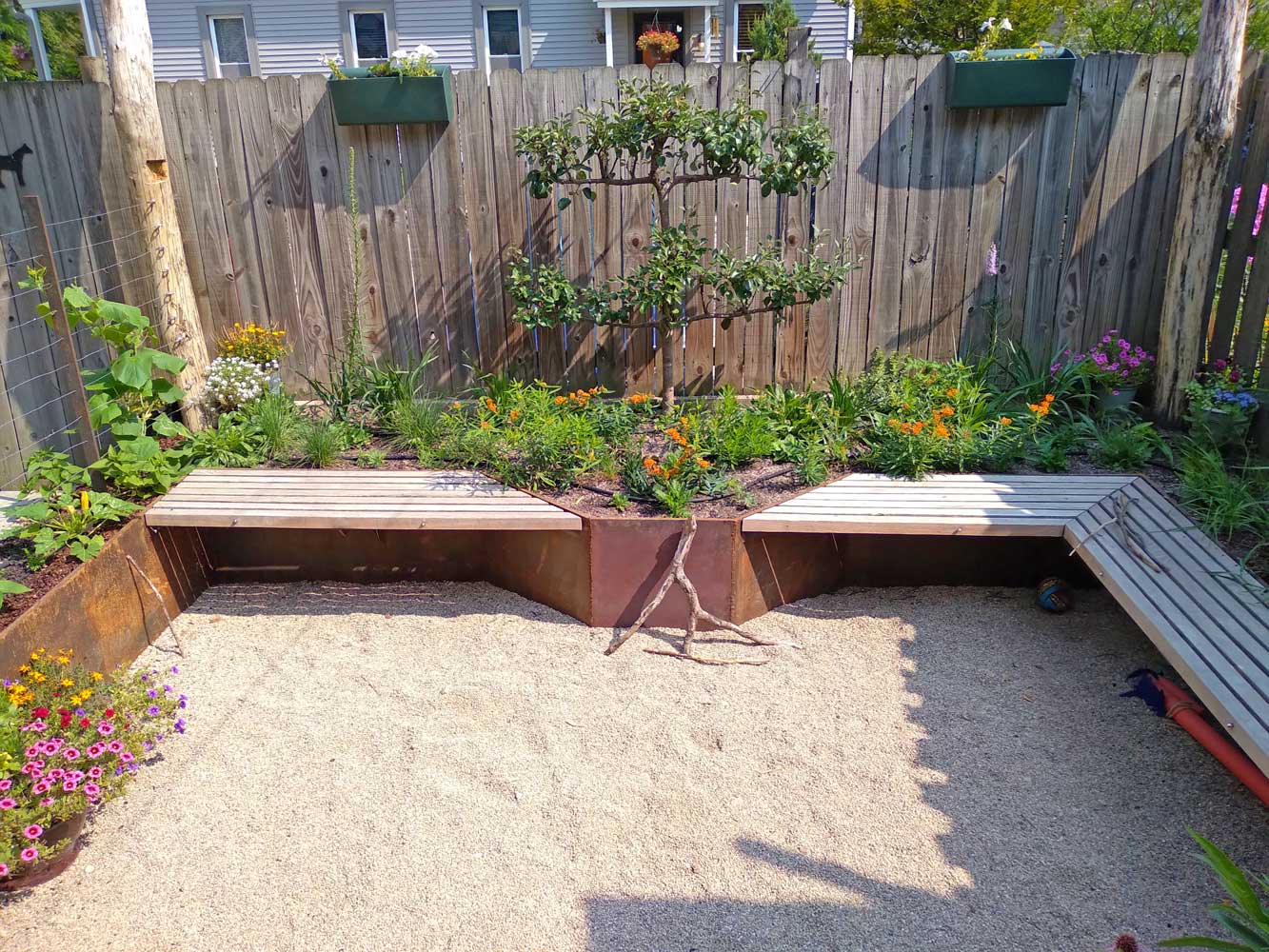 Our clients reached out to us looking to add more character and function to their small, urban backyard. To achieve this, we designed and constructed a sunken patio decorated with native plantings to complement their existing pear tree. A custom climbing wall, handmade from black locust wood, was installed to create a unique play space for the clients and their children.